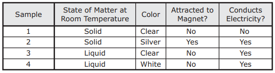 The table lists some properties of four different samples of matter.