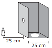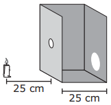 A teacher takes the top and a side off a box. She cuts a hole in another side and puts a candle outside the box, as shown below.