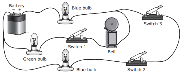 This circuit has three lightbulbs and a bell.