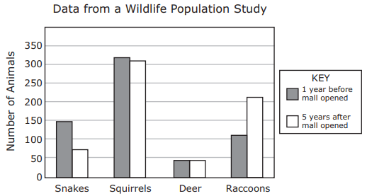 Data for four animal populations in a wooded area were collected before and after a shopping mall was constructed near the area. The graph shows changes in the populations.