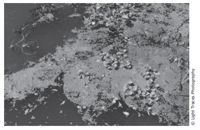 This photograph shows plants growing on the surface of a pond.