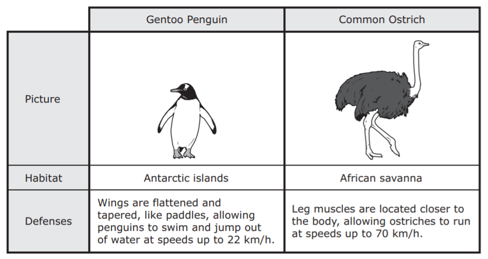 The defenses of two flightless birds that live in different habitats are shown.