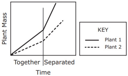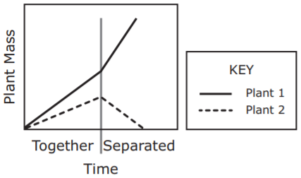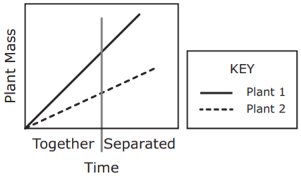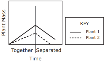 In an experiment, two plants are grown together for a time and then separated. Plant 2 is a parasite of Plant 1. Which graph best predicts the growth of Plant 1 and Plant 2 during the experiment?