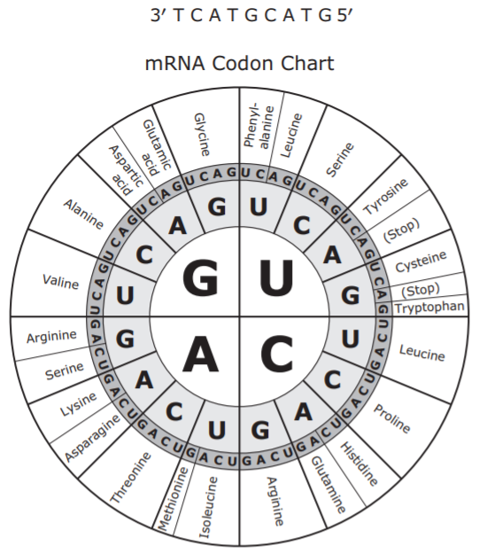 A partial DNA segment and an mRNA codon chart are shown.