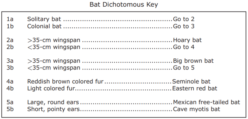 Students examine images of a certain species of bat commonly found in Texas. Using the bat dichotomous key, they conclude that the bat species is a Mexican free-tailed bat due to its large, round ears.