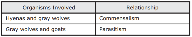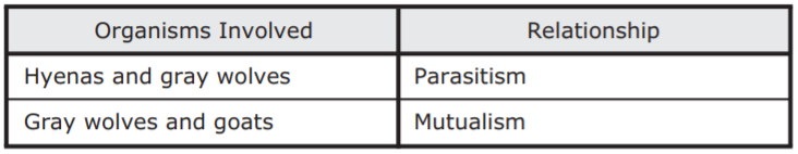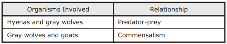 Researchers have observed striped hyenas and gray wolves hunting together in certain areas. One hypothesis suggests that changing hunting behavior aids both species in obtaining better and more resources. In this hypothesis the hyenas benefit because the wolves chase and take down large animals, such as goats, that the hyenas usually cannot catch alone. The wolves benefit from hyenas using their jaw strength to crack open large bones of prey to access additional nutrients from bone marrow. Which table best identifies the ecological relationships among the gray wolf, hyena, and goats?