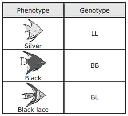 Some angelfish colors are determined by codominance. Possible phenotypes and genotypes of angelfish colors are shown.