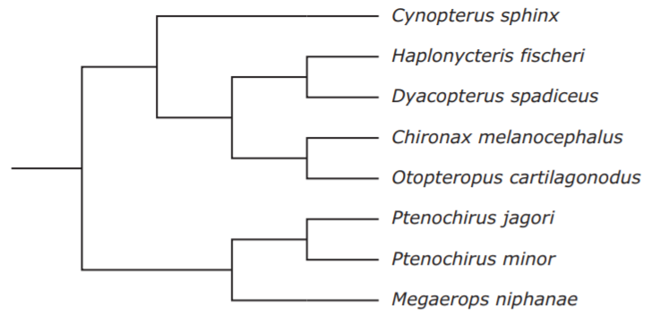 Researchers analyzed a mitochondrial gene of different bat species to determine relatedness. A cladogram of their results is shown.