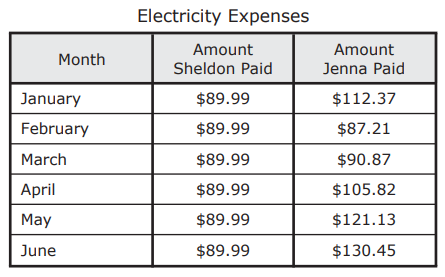The table shows the amounts Sheldon and Jenna paid for electricity in their apartments each month for the last six months.