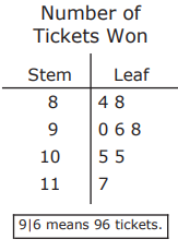 The stem and leaf plot shows the numbers of tickets Stephen won when he played games at a carnival.