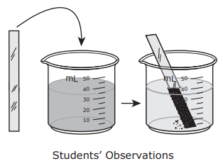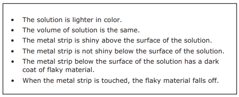 For a laboratory investigation some students put a strip of shiny metal into a beaker of blue solution and then stored the beaker on a shelf overnight. The next morning, the students recorded observations about the metal and the solution in the box below.