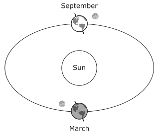 The beginning of autumn in North America is in September, but the beginning of autumn in South America is in March. The diagram shows the positions of Earth, the moon, and the sun on one day in September and one day in March.