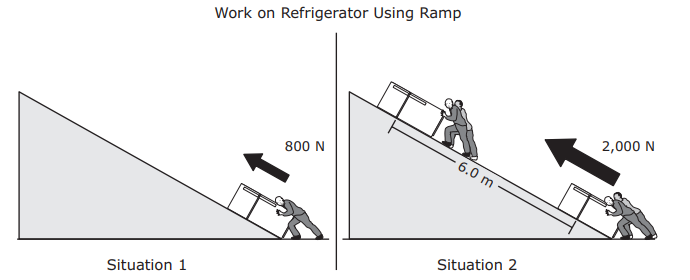 The diagram of Situation 1 shows one person failing to move a refrigerator up a ramp, while the diagram of Situation 2 shows two people successfully pushing a refrigerator up a ramp.