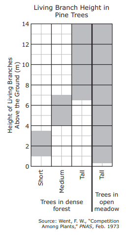 A group of scientists studied some trees in a pine forest. In the densely forested areas, the trees were within 1 m of each other. The scientists observed that these trees had dead branches near the ground. They measured the height above the ground at which the first living branches were found on different-sized trees in the forest. Then they repeated this procedure on the same kind of trees in an open meadow. This graph summarizes the scientists’ data.