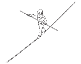 The picture shows an aerialist walking on a tightrope and holding a balancing bar.