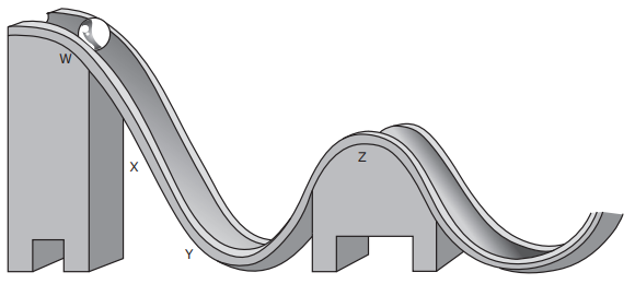 A marble is given potential energy by being placed at Location W. When the marble is released, it rolls down the track.