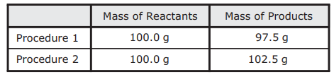 As part of an investigation, students combined substances in a beaker to observe chemical reactions. They performed two procedures. They measured the mass of each substance before and after each reaction. The table shows their observations.