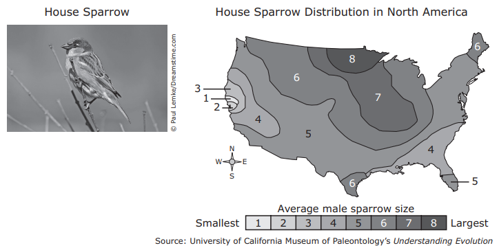 The house sparrow was first introduced to New York in 1851. It is now distributed across most of North America. As the species expanded its range, it began to live in environments that were different from its original habitat. The birds now vary in size, depending on their geographic location. The map shows the distribution of house sparrows by size.