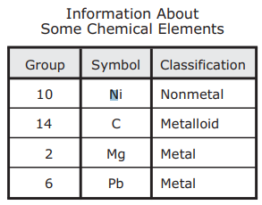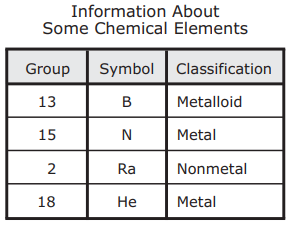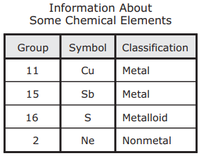 Four students were asked to complete a table for a science assignment. Each student selected one chemical element from each of four groups in the periodic table and then classified each element as a metal, a nonmetal, or a metalloid.