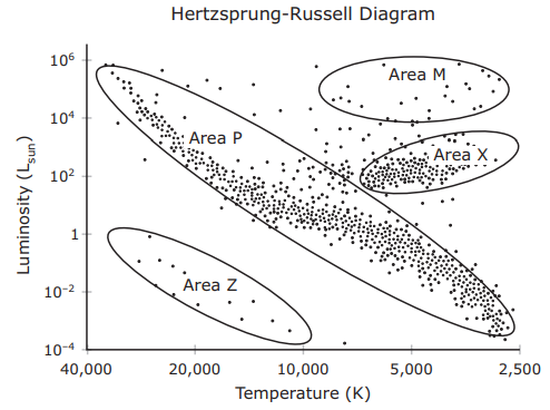 Most stars in the universe fit into one of the four areas on this Hertzsprung-Russell diagram.