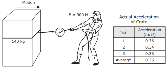 A physics teacher performed a demonstration for a science class by pulling a crate across the floor and measuring the force with a spring scale. While she pulled, a student measured the acceleration of the crate with a handheld electronic device. The results of three trials are shown below.