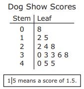 The stem and leaf plot shows the scores given to the dogs at a dog show. Possible scores were between 0.1 and 5.0.