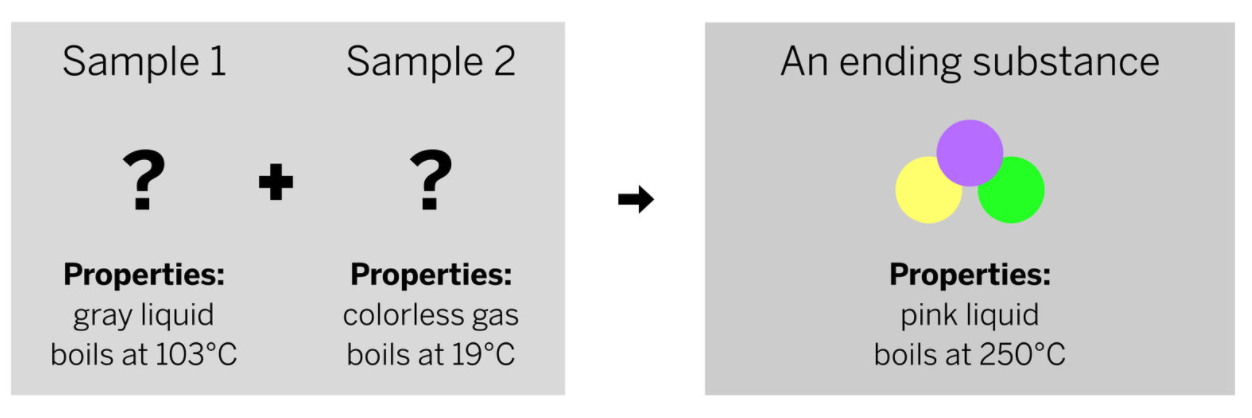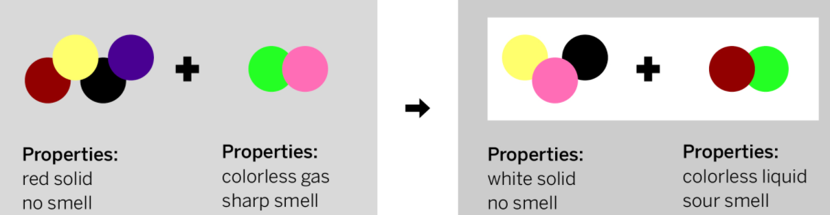 Does this model correctly show why the properties of the ending substances are different from the properties of the starting substances?Describe what could be correct or incorrect about his model.