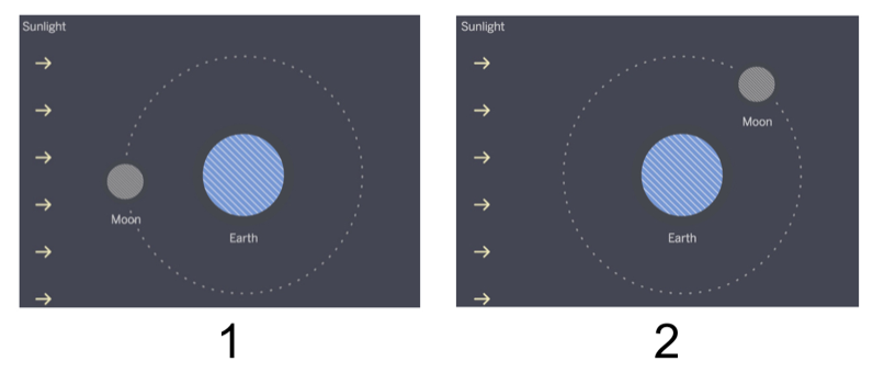 The diagrams above show Earth and the Moon in different positions, as seen from above (top view). Sunlight is coming from the left, but these diagrams do not show what parts of Earth or the Moon are light or dark.