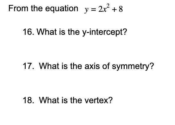 Evaluate the equation, 3x2 + 6, when x is 0. (hint y-intercept)