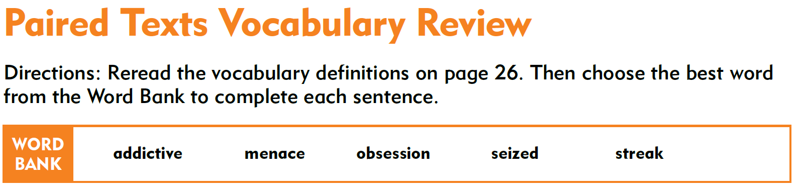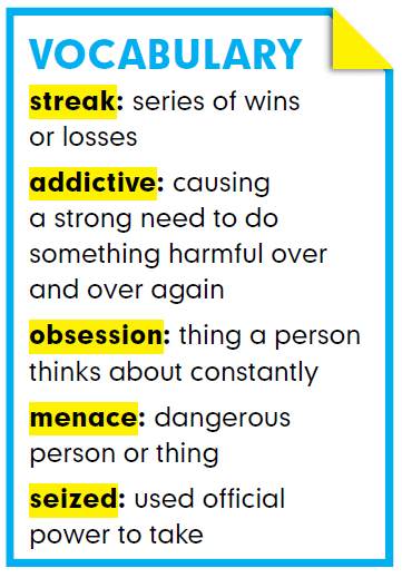addictive | arrow_right_alt | My soccer team is on a winning _______________, but I don’t think it will last now that our captain is out sick. |