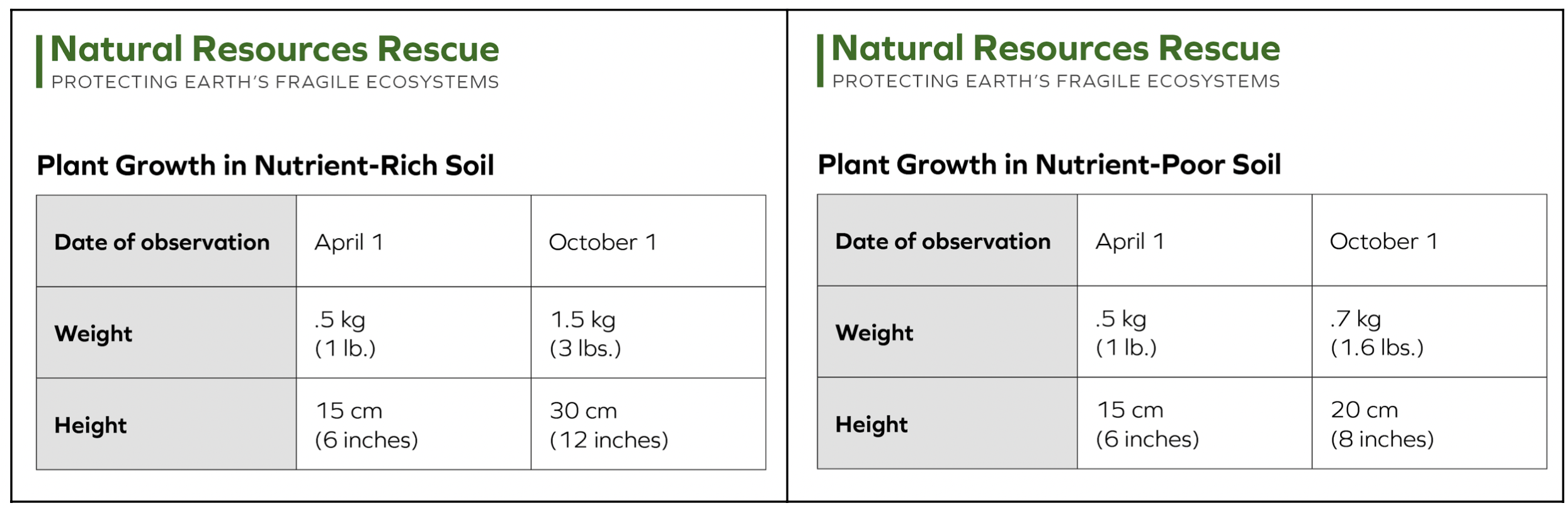 The pictures below show the scientist’s data. Type in the chart - what do you notice about the plant grown in nutrient-rich soil compared to the plant grown in nutrient-poor soil?
