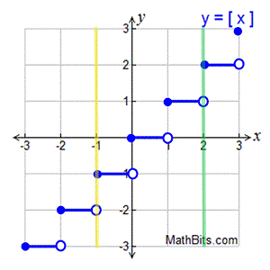 I do the process again. I go to where x = 2 and that is where I put a light green line to clarify. Again, I see two points on the graph and I must choose the closed circle. So..