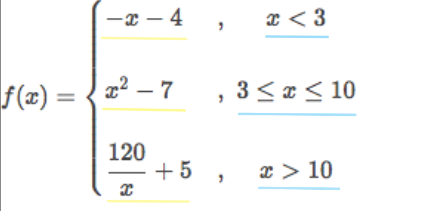 When given a piecewise function, you must determine which values can be applied to which function. I underlined the functions in yellow and the restrictions of the domain (x-values) in blue.