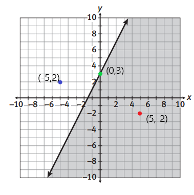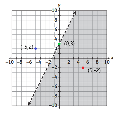 Sometimes we might not be given an inequality and we may just be given a graph. For something to be a solution to an inquality, it must be in the shaded region or on the solid line that makes up the inequality. If the coordinate in question is in the unshaded region or on the dotted line, it is not a solution. Below I discuss the three colored coordinates on the graphs to the left.