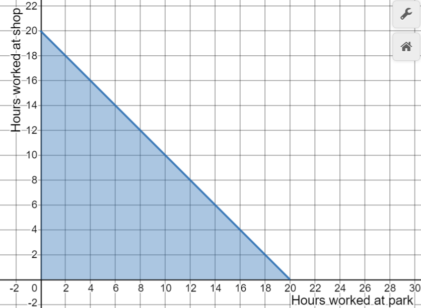 Sometimes we may also be given a word problem related to either an inequality or graph. On the left, I have an inequality graph that represents x number of hours he works at the park and y number of hours he works at the shop. He can not work over 20 hours.