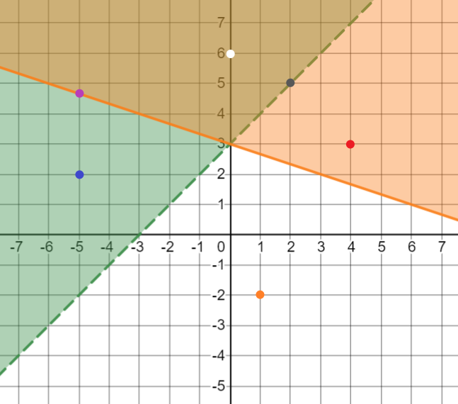The orange, blue, and red coordinates are not solution since they are not in both shaded regions.