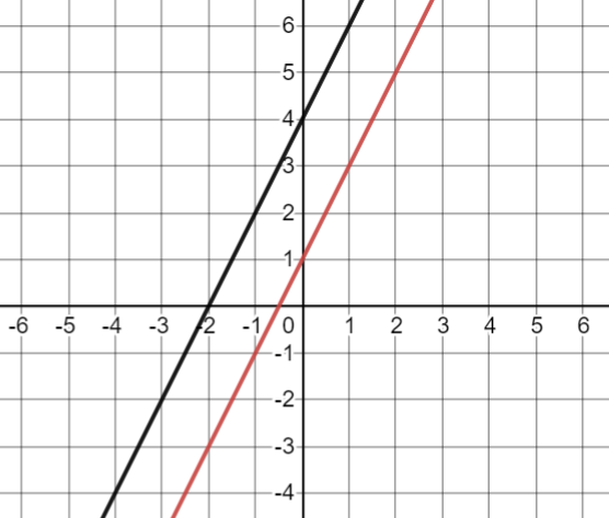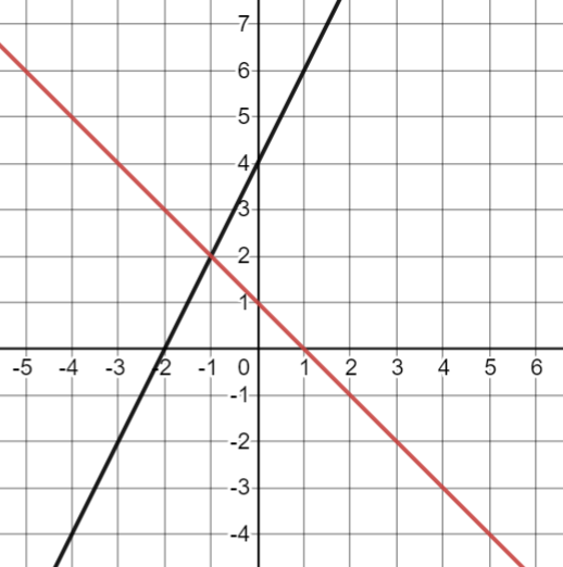 When solving a system of linear equations, we are looking for a coordinate that makes both equations true and on the graph, this is where to two lines intersect. When given access to Desmos, it's easy to find the solution since we can tell where they intersect. On the graph on the left, we can see that the two lines intersect at (-1,2).