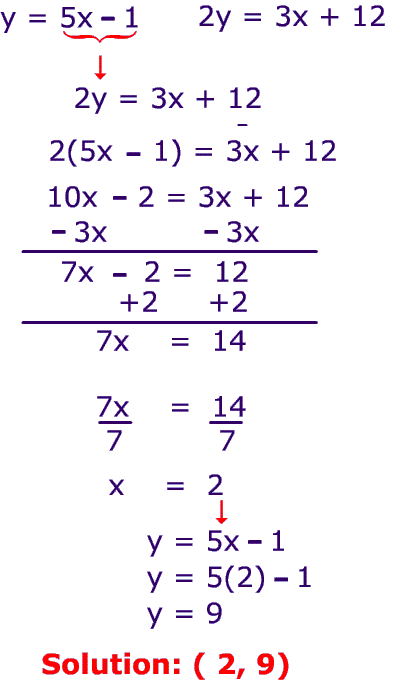There are two other methods to solving a system. The first is the substitution method. The idea is to subsitute one equation in the other to find one variable. When you get the value for that variable, plug it back into one of the original equations to get the other variable. Here is an example.