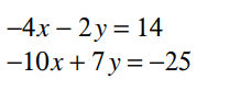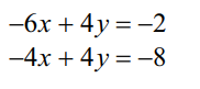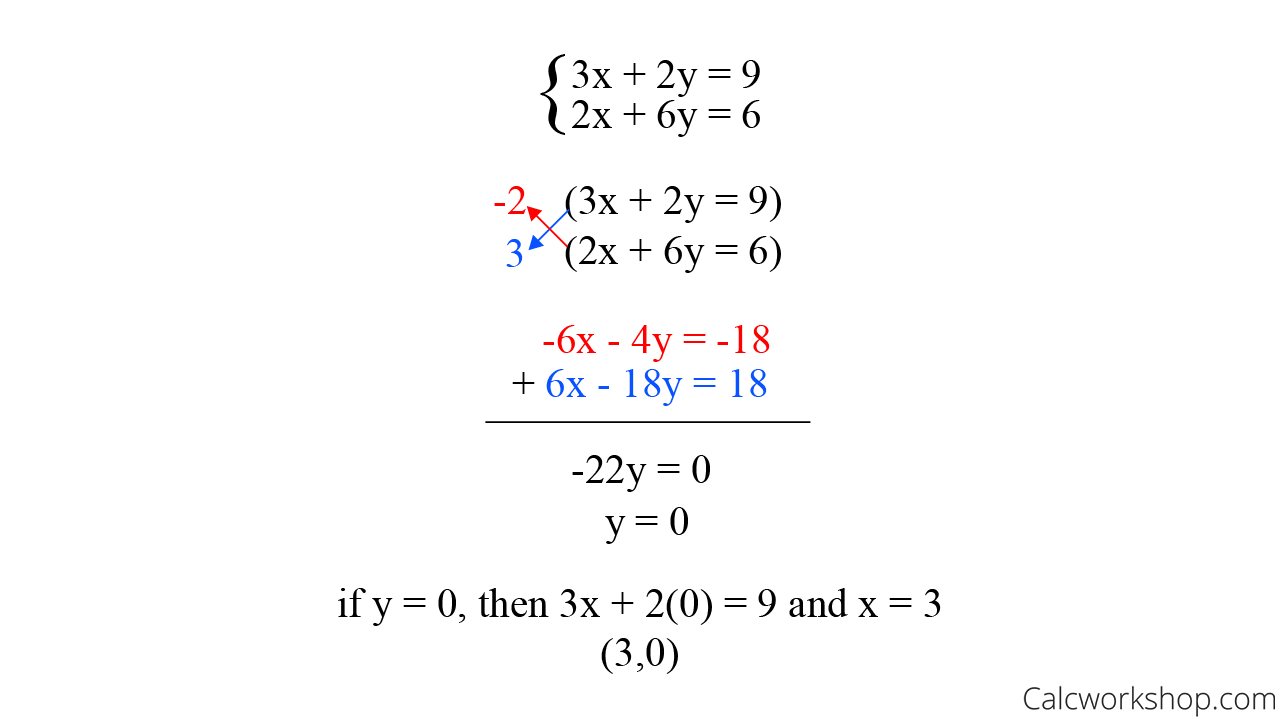 The other way of solving a system is elimination method. We use this method if both equations have the x, y, and constant values in the same order. We multiply the equations to "eliminate" one of the variables to solve for the other. After we get that value, we substitute it back into one of the originals to find the other variable. Here is an example.