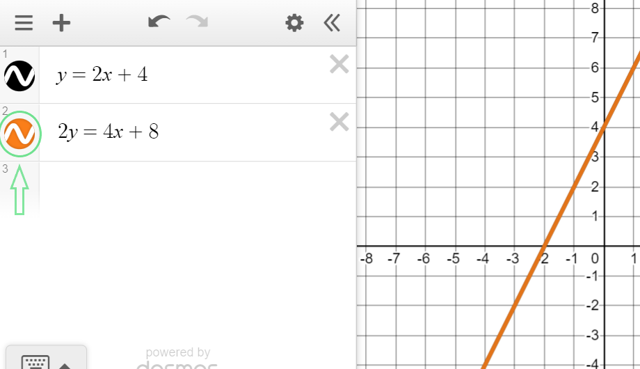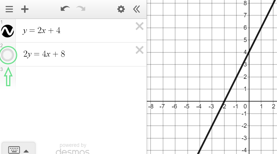 Sometimes when you graph both equations, you will only see one line. This is because both equations represent the same graph. On desmos, if you select the spot I circled in the picture below, it will reveal the other line. If this is the case, you have infinitely many solutions.