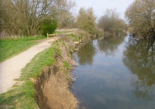 There is a long meter-deep scar in the soil where a section of the riverbank has slipped downward into the river.