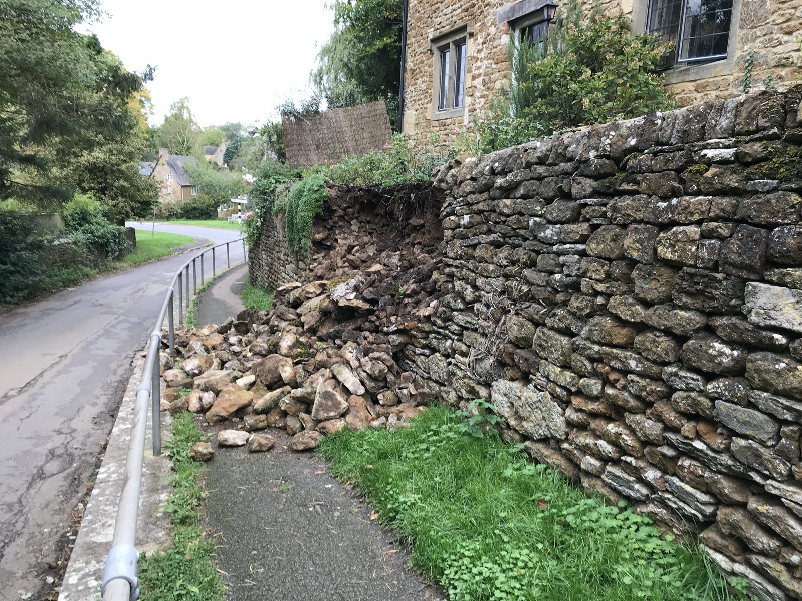 The homeowner had clearly worked hard to hold the steep hillside in place by constructing a stone wall, but now sections of the wall and soil have tumbled onto the sidewalk.