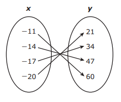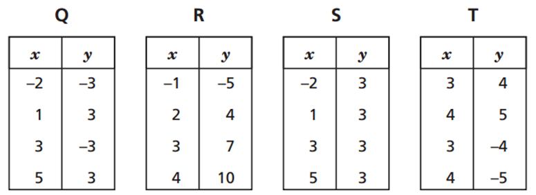 The four tables below show relationships in which the x values represent inputs and the y values represent the corresponding outputs.