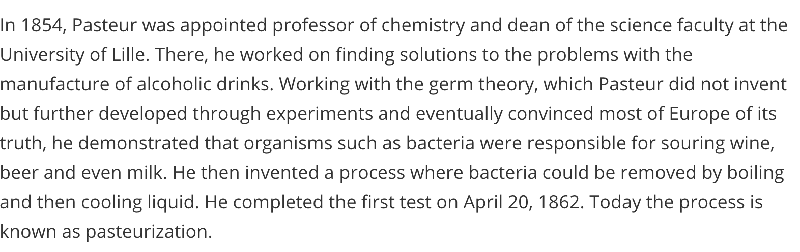 First test on pasteurization | arrow_right_alt | April 20, 1862 |