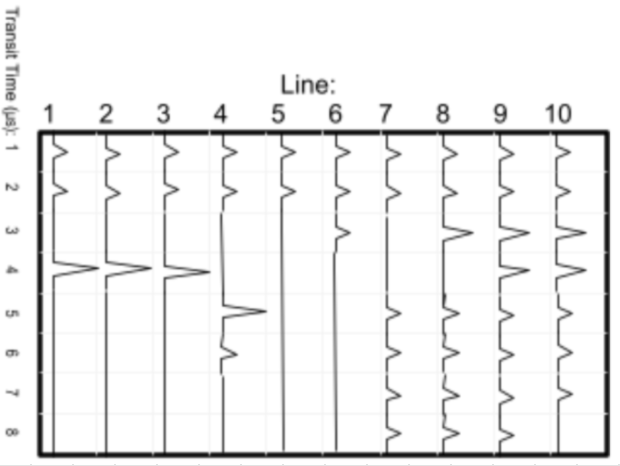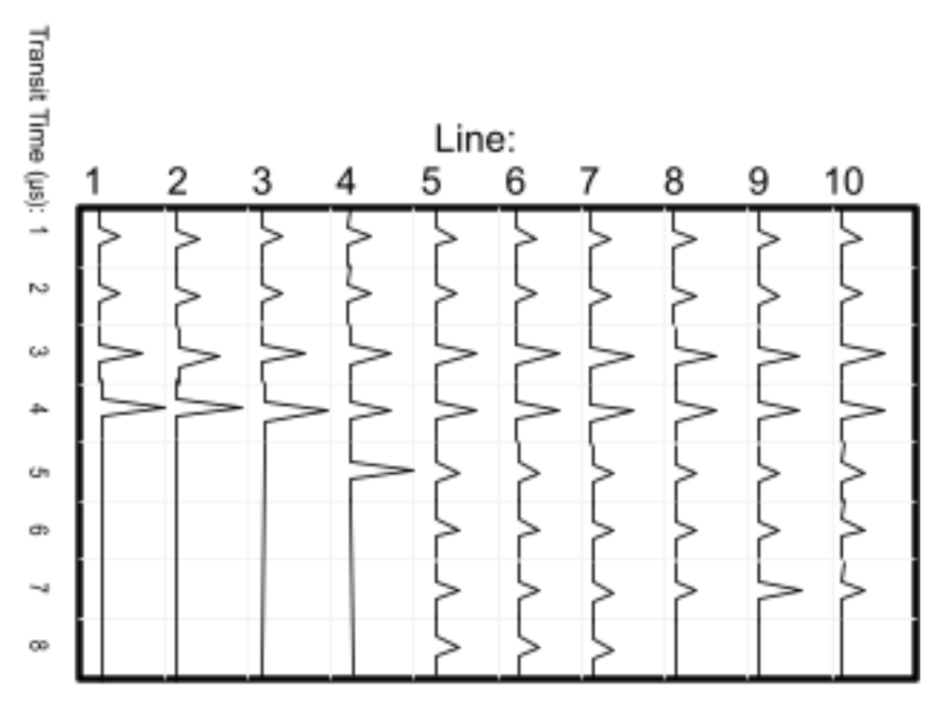 Background on the ultrasound medical imager: The transducer has ten lines that are spaced 5 mm apart. Each line emits an ultrasound pulse at a frequency of 6 MHz (6 million waves/second or 6 waves/μs). These pulses travel at the speed of sound in the human body which has an approximate wave speed of 1.5 millimeter/microsecond (mm/μs). The diagrams below show the raw data of the transit time of the return signals to the transducer for each of the 10 lines.