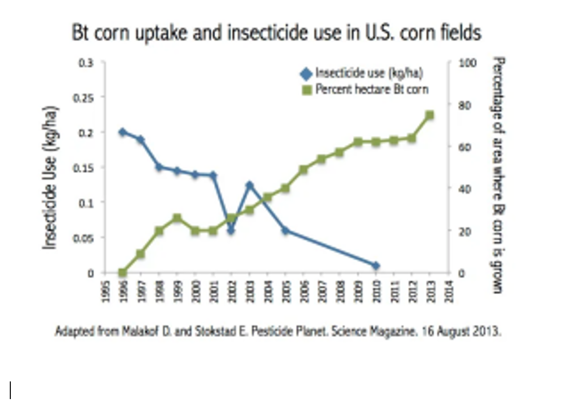 Bt corn is a corn that has been genetically engineered to produce a chemical naturally produced by soil bacteria. This chemical kills some insects that try and feed on them. Based on the graph, what impact can Bt corn have on the amount of pesticides used in the environment based on the graph?