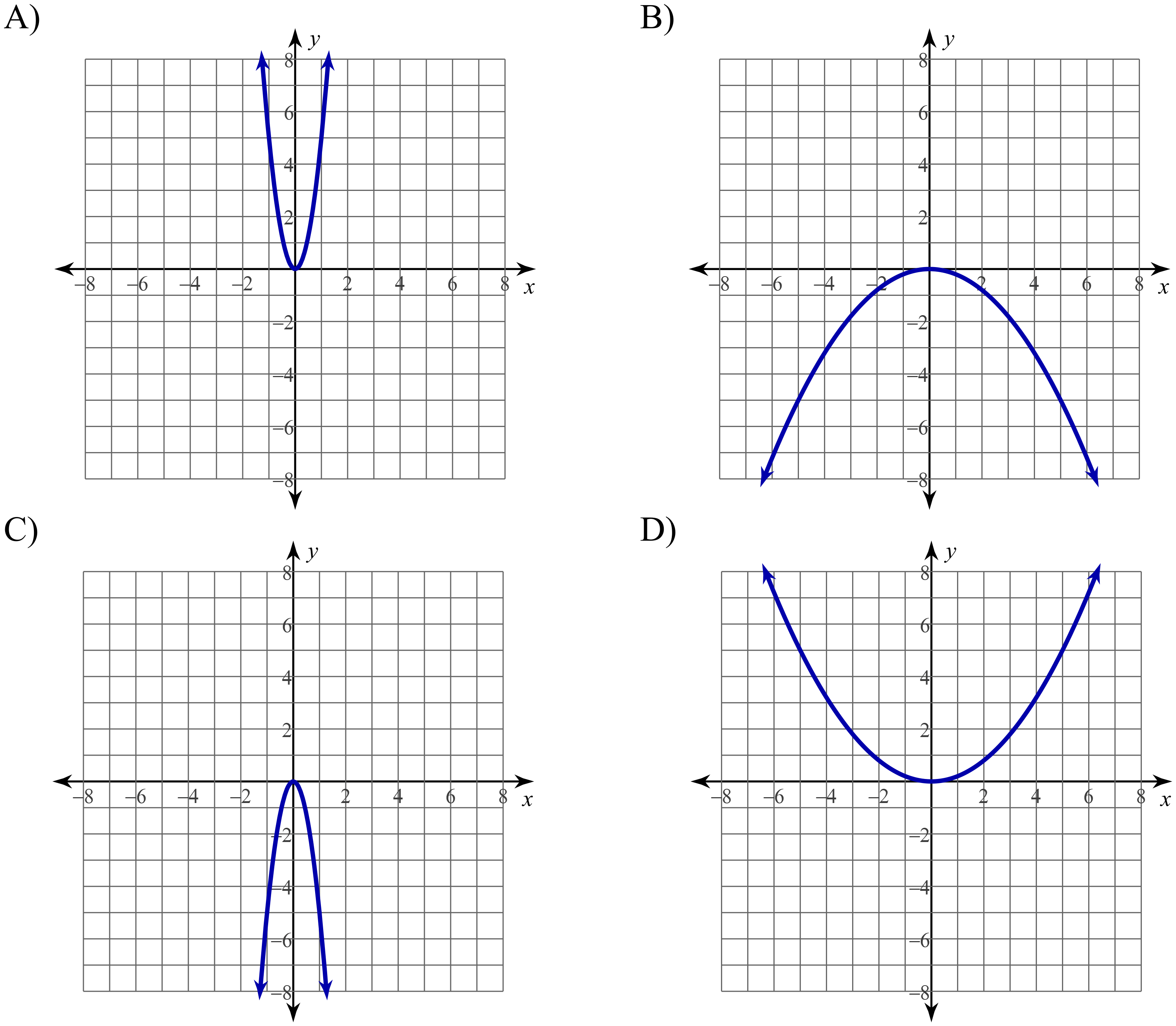 The graph of f(x) = x2 is reflected over the x-axis and stretched vertically to create the graph of function g. Which graph could represent the graph of function g?
