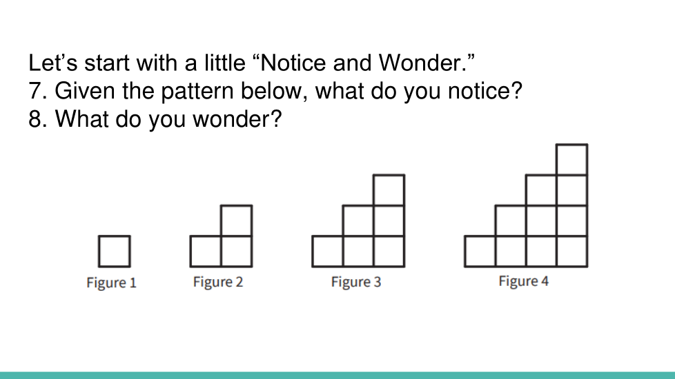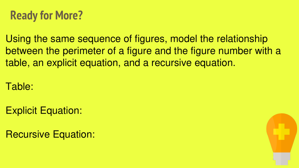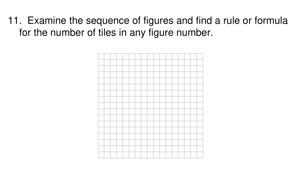 Examine la secuencia de figuras, incluidas las que dibujó, y encuentre una regla o fórmula para el número de mosaicos en cualquier número de figura.