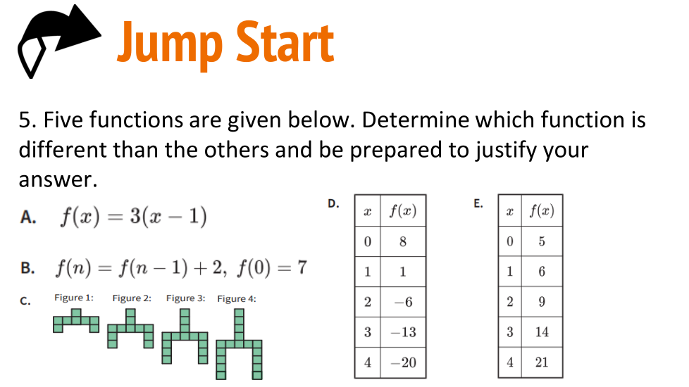Cinco funciones se dan a continuación. Determina qué función es diferente a las demás y prepárate para justificar tu respuesta.