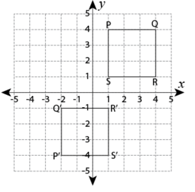 A figure undergoes a sequence of two transformations, starting with the original square PQRS and ending with square P'Q'R'S'.